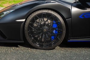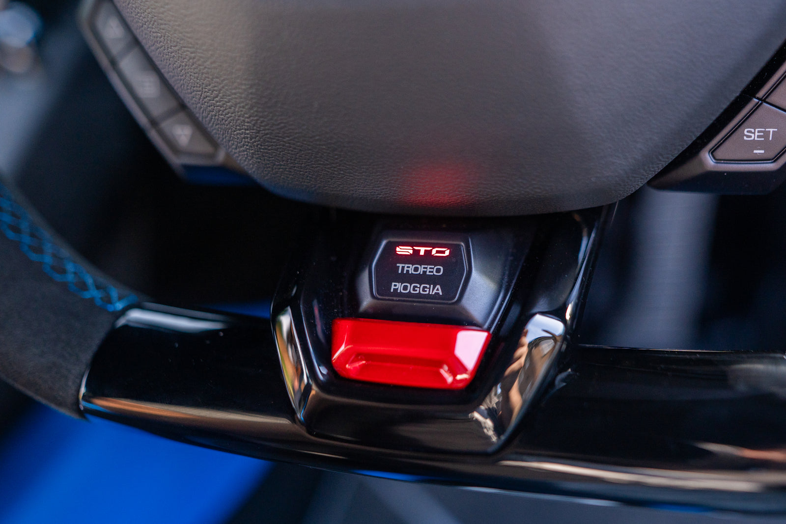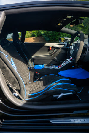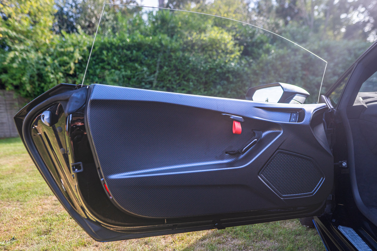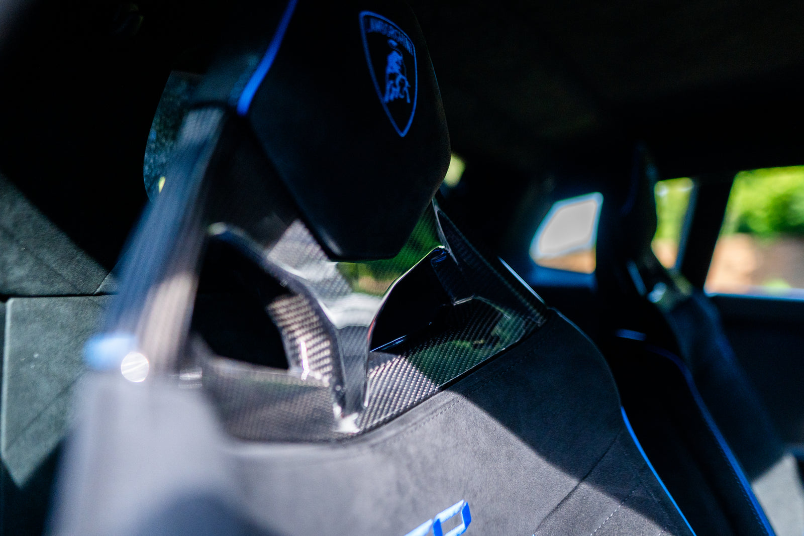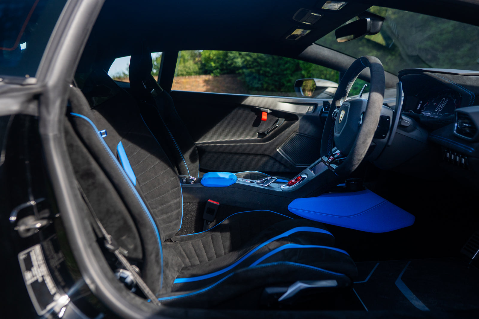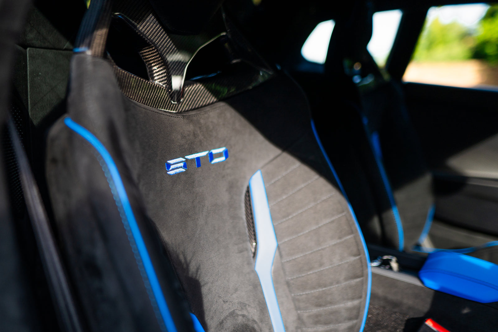 This particular example is a UK-supplied, delivery mileage car finished in Nero Helene with Bianco Monocerus STO livery and a Blu Amon-accented Sportivo Alcantara interior. It’s specified with the Full Exterior and Interior Carbon Packs, forged Hek centre-lock wheels, and the optional lifting system.